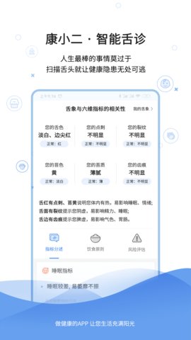 1、舌象拍摄:康小二允许用户通过拍摄舌头的照片,系统会根据舌苔的状态进行初步的健康评估。