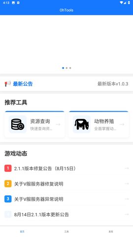 1、首先在官方网站下载安装Oh App,完成后打开软件,进入首页,浏览推荐工具和最新的游戏动态。