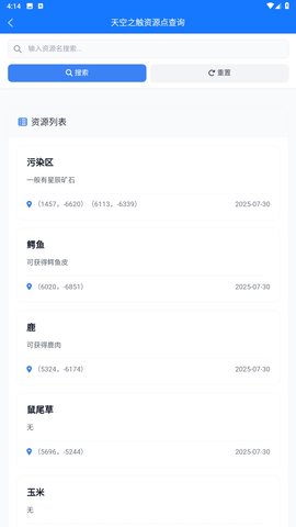 3、搜索完成后,软件会展示资源列表,包含资源所在坐标和可以获取的物品,方便玩家顺利找到目标资源。