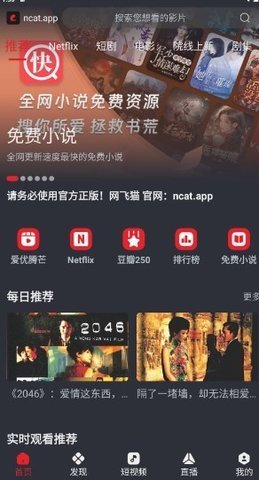 1、下载并安装奈飞猫影视应用,打开后你会看到主界面展示的各种影视推荐。
