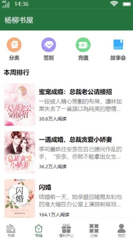 1、下载并安装杨柳书屋,打开软件时,你会看到一个简洁的首页,里面有推荐的书籍和分类。