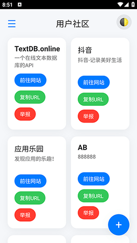 5、若用户希望上传自己的站点,可以在社区板块点击右下角的加号,输入网站名称和URL,最后提交即可完成上传。