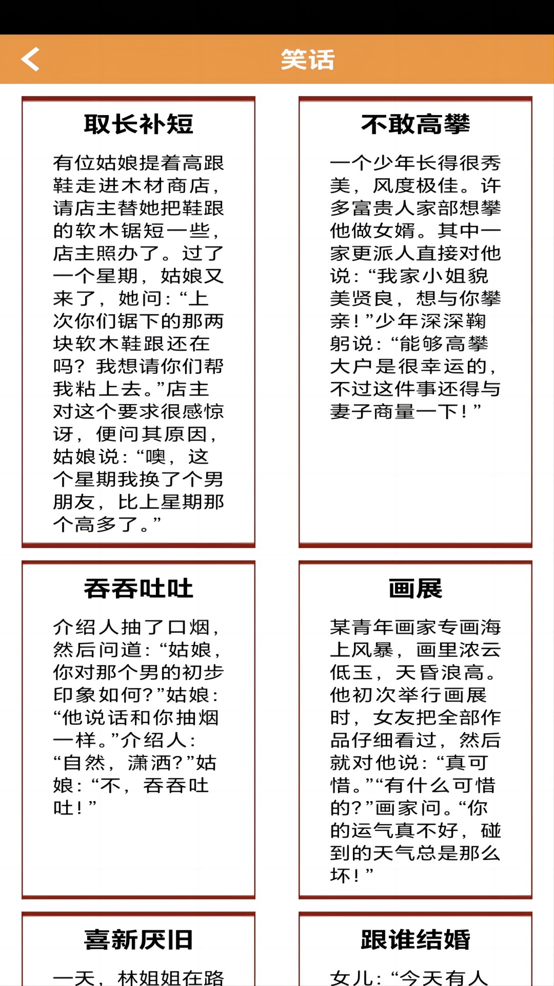 3、各类幽默笑话的汇集,为用户提供了丰富的笑料,能够在日常生活中带来轻松愉悦的时刻。