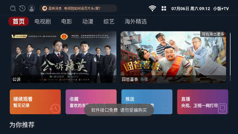 1、打开小饭+TV后,用户将看到首页推荐的热门影片,直接点击感兴趣的影片即可开始观看。