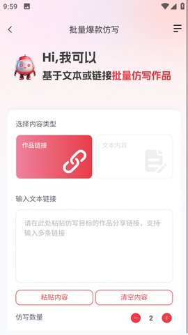 1、通过输入各平台的热门链接或文案,批量生成风格相似的作品,方式大大降低了创作的难度。
