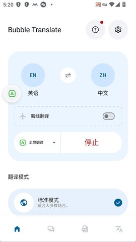 3、返回主页后,用户只需点击开始翻译按钮,便可进入翻译模式,准备好进行翻译操作。