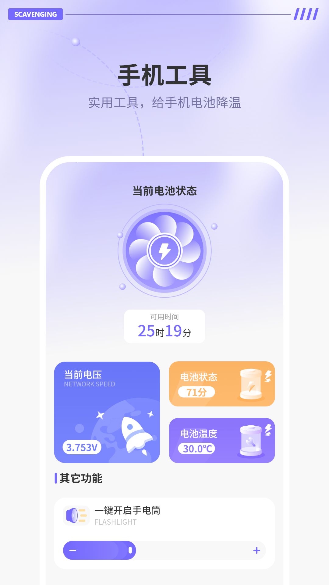 3、除了清理功能,还整合了几个日常使用频率较高的小工具,比如模拟手电筒的屏幕补光,这些附加模块不占用额外安装位置。