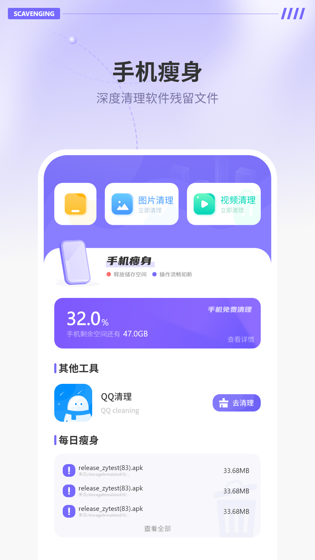 手机清理是一款释放存储空间、优化系统性能的实用工具,主要面向安卓设备用户。软件通过扫描手机内部存储中的冗余文件、缓存数据以及各类应用产生的临时文件,帮助识别出可安全删除的内容。日常使用中积累的聊天记录附件、重复照片视频等占用大量空间,手动清理往往效率低下,软件能自动归类并建议清理项目,操作过程不需要专业知识。