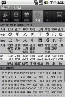 5、在生成的八字信息中,查看大运、小运、流年等多项内容,进一步了解自己的命理结构。