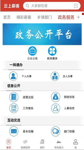 1、打开云上蕲春应用后,用户首先会看到首页,首页上有多个功能模块,直接点击政务服务进入相关页面。