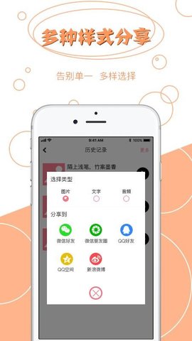 6、根据分享需求选择文字、图片或音频格式,挑选合适的分享渠道,将内容快速转发给他人,分享变得轻松快捷。