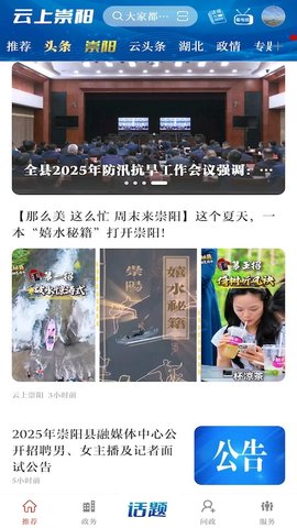 1、打开云上崇阳客户端后,用户会看到一个简洁的首页,首页上有多个功能模块,方便用户快速选择。
