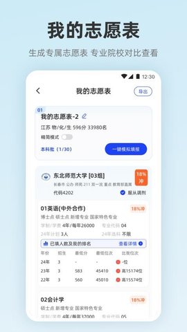 2、志愿模拟填报:用户能够模拟真实的填报流程,从选择院校到确定专业组,提前熟悉填报步骤,降低实际填报中的失误。