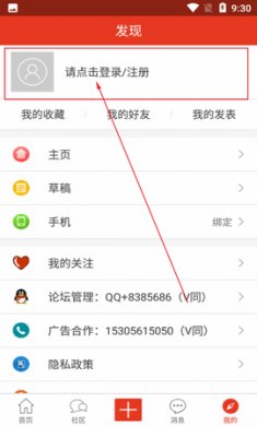 下载并安装【淮北论坛APP】后,打开应用,点击右下角【我的】,然后在页面顶部点击【请点击登录/注册】。