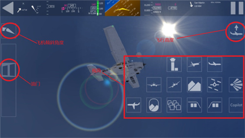 6.飞机操作,玩家进入游戏之后可以看到左右两边有控制按钮,左边是飞机倾斜角度以及油门,右边可以调节视角和飞行高度。