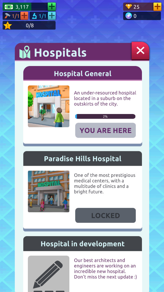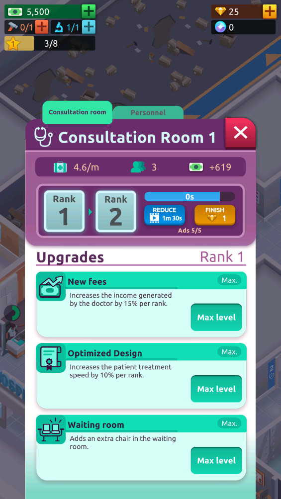 3、医院内的设施和设备种类繁多,从基础的急救室到高端的手术室,每一项都需要玩家精心规划和投资,以满足日益增长的病患需求。