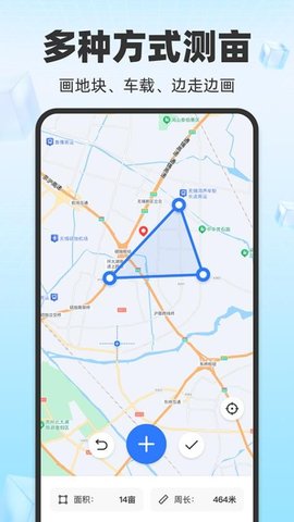 3、画地块功能:在地图上选择三个点,快速测算出地块的周长与面积,适合土地勘测和规划使用。