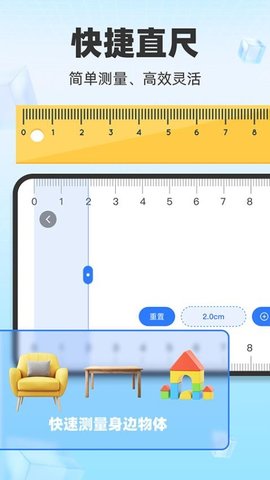 2、尺子功能:通过开启智能尺子,用户能快速测量周围直线物体的长度,获取准确的测量数据,方便日常生活中的各种需求。