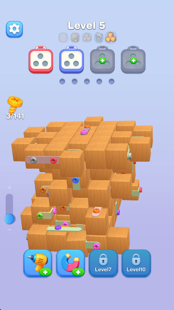 2、游戏的解谜机制设计巧妙,玩家需要运用逻辑思维和空间想象力,寻找合适的组合来解锁螺丝,带来极大的挑战感。