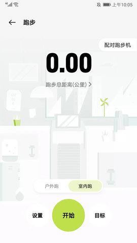 6、进入【运动】界面,选择跑步或其他运动项目,设定目标后点击【开始】记录运动数据。