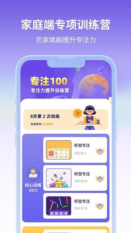 专注100是一款帮助儿童提升多维度能力的应用,通过科学的训练工具和丰富的课程,系统性地增强孩子的专注力、观察力、记忆力和逻辑思维能力。当孩子在游戏中通过趣味任务集中注意力时,轻松提升了自己的学习能力。平台结合了专业测评与智能数据统计,让家长能够随时了解孩子的成长动态,为他们的未来打下坚实的基础。