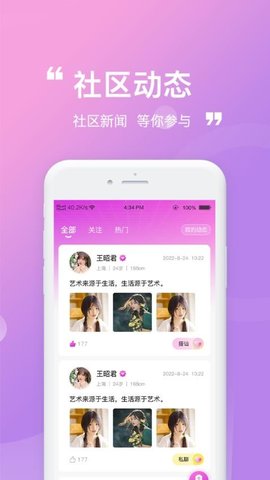 3、社区动态:展示平台最新推送的精彩动态,快速了解身边人的生活状态,增加社交的趣味性。