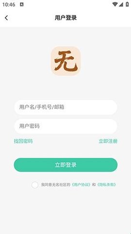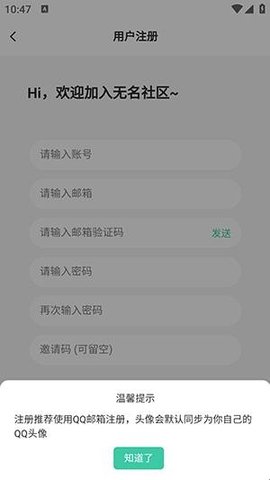 打开无名社区应用,点击首页的我的界面,找到头像图标进行注册或登录。