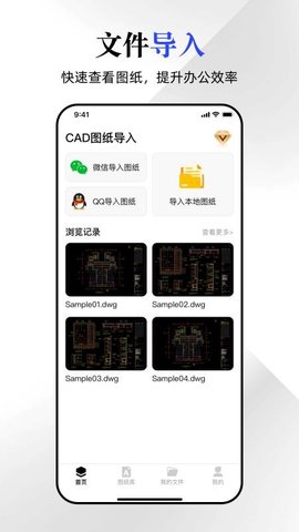 1、图纸导入:方便地从社交平台或手机本地存储中导入CAD文件,快速添加新的图纸资料。