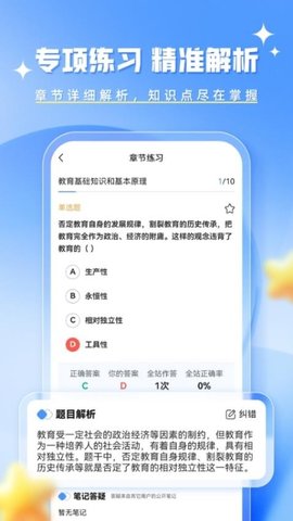 3、多种模式适配需求:支持按科目、章节进行专项练习,灵活适应不同复习阶段的需求。