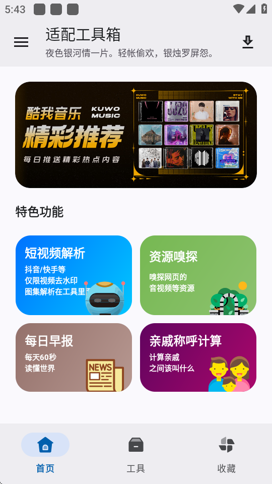 适配工具箱是一款功能实用且完全免费的多功能工具箱软件,为用户的生活和工作提供便捷的解决方案。整合了众多实用工具,涵盖生活、娱乐、资讯及系统管理等多个领域,让用户在一个平台上轻松找到所需的功能。独特的短视频解析、资源搜索及每日新闻等特色功能,使得用户在日常使用中体验到极大的便利,