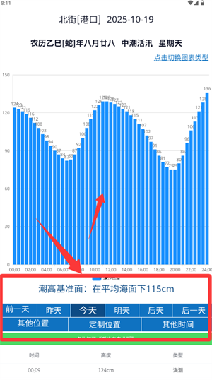 点击图表可切换显示模式,支持查看潮高基准面信息,或选择具体日期查询历史及未来潮汐数据。