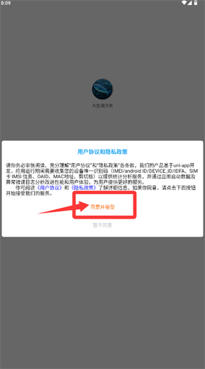 启动应用后,先阅读《用户协议》与《隐私政策》,确认无误后点击【同意并接受】。