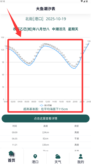 进入首页,即可看到北街港口等地点的潮汐曲线图,直观展示水位随时间的变化趋势。