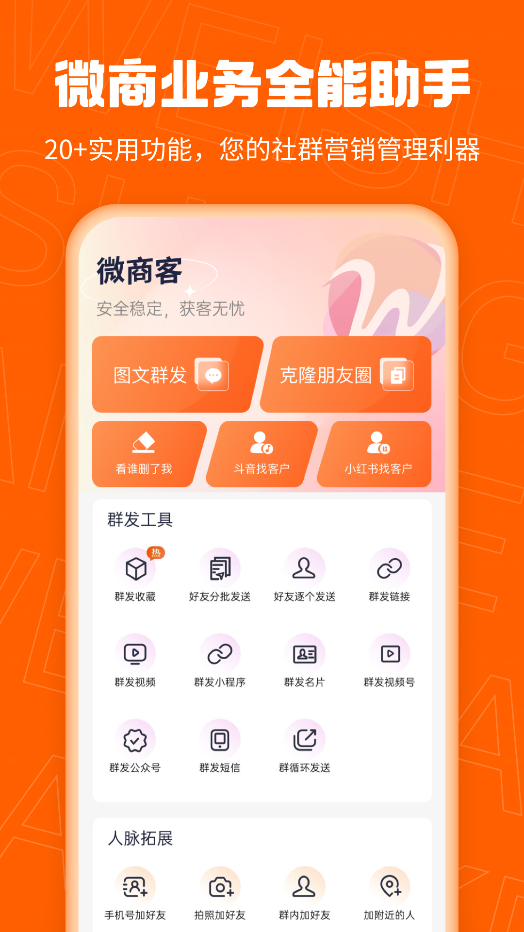 微商客是一款专业高效的数字营销软件,帮助用户在社交平台上高效地拓展客户和提升品牌影响力。您是一位小型企业主,面临着如何吸引更多顾客的挑战。微商客通过整合多种实用功能,简化了营销流程,使您能够轻松管理客户、群发信息以及分享多媒体内容,帮助您在竞争中占据优势。您不仅能提高工作效率,还能在多个社交平台上实现业务增长,确保每一条信息都能精准传达给目标受众。微商客的设计理念围绕着用户的实际需求展开,力求为每位用户提供高效的营销支持,助力他们在复杂的市场环境中脱颖而出。