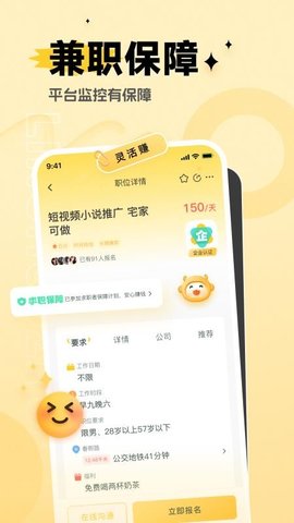 4、岗位详情展示:每个岗位都提供详细信息,包括工作内容、薪资标准和结算周期,帮助用户全面评估。