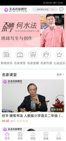 1、打开美术名家课堂应用,进入首页,您会看到各类课程的推荐和分类。