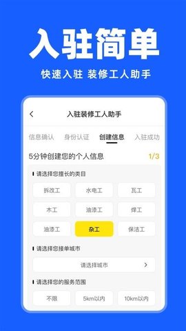 4、个人信息创建功能支持师傅选择擅长的服务类目,设定接单城市和服务范围,帮助他们更好地展示自己的专业能力。
