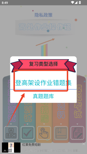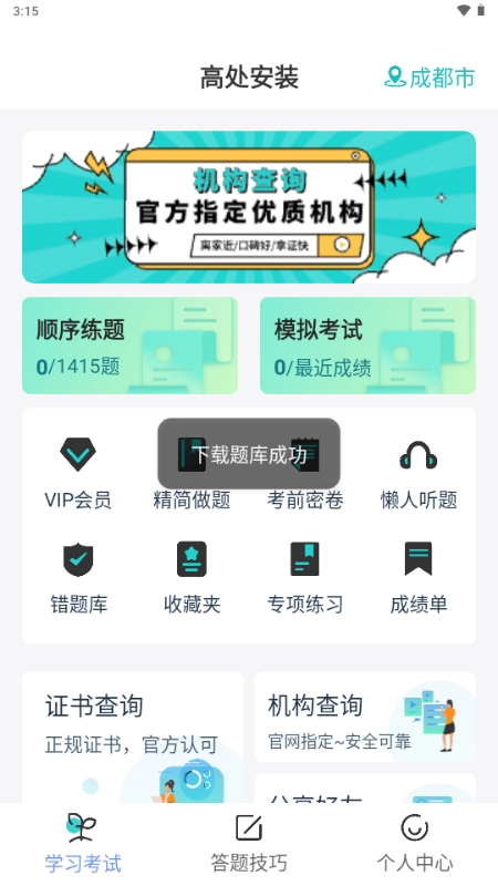 1、打开App后,首先选择您要考取的证书类型和对应题库,进入专属学习界面,即可开始针对性练习。