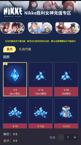 2、登录后,选择你想充值的游戏,NIKKE,点击进入充值页面,选择相应的充值金额。