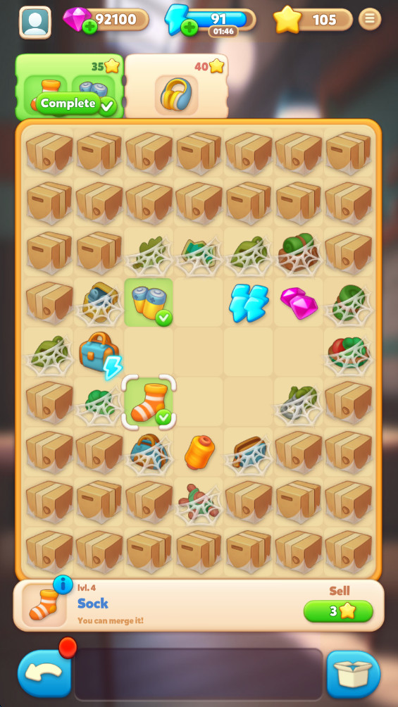 2、当你拖动两个相同的物品到一起时,们会合并成一个新的物品,继续寻找其他相同的物品进行合并,完成关卡的目标。