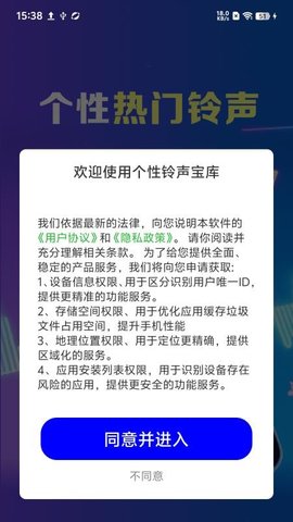 1、打开个性铃声宝库应用后,点击同意并进入按钮,进入主界面,开始探索铃声的世界。