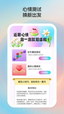 2、内置的心情测试功能让用户通过趣味问答,快速了解自己的心理状态,为日常生活的情绪管理提供了科学依据。