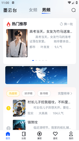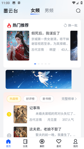 1、打开墨云台小说应用,进入首页后,你会看到热门推荐和最新上架的小说。