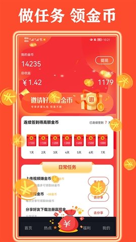 1、每日签到可获得金币奖励,观看广告还可额外获取丰厚收益,观看越多,赚得越多。