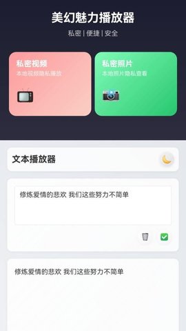 美幻魅力播放器是一款独特的应用软件,能够满足用户在私密播放、相册预览以及文本播放等多个方面的需求隐私保护机制让用户在享受内容的能够确保个人信息的安全。还支持多种文本格式的播放和编辑,让用户在处理文档时更加便捷。美幻魅力播放器不仅是一款工具,更是用户生活中的得力助手。