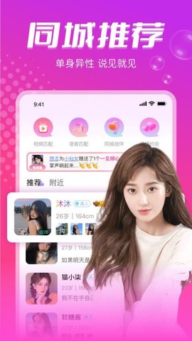 本地陌约是一款同城交友的应用,为单身男女提供一个高效的脱单平台。您在繁忙的工作之余,便可以轻松找到身边志趣相投的人。借助精准的定位技术,您不仅能与同城用户进行即时聊天,还能通过视频约会和语音连麦等多种互动方式,打破陌生感,迅速拉近彼此的距离。