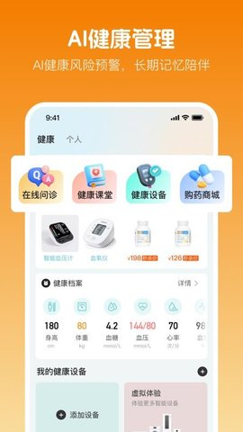 5、在健康管理板块,您可以创建个人健康档案,连接智能检测设备,系统将自动记录并保存您的健康数据。