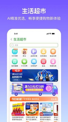 1、打开应用后,您将进入生活超市界面,点击您感兴趣的品类专区,食品生鲜,浏览商品列表。