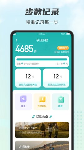 1、开启应用后进入主界面,系统会自动开始记录当前步数,上方显示当日已完成步数与目标进度。