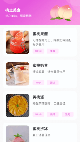 桃满满是一款关于桃子的实用工具软件,打开应用就能看到各式各样的桃子品种介绍和美食制作方法。从水蜜桃到油桃,每个品种都有详细的产地信息和口感特点,让你在挑选水果时更有把握。喜欢下厨的朋友还能找到用桃子制作的创意菜谱,从简单的沙拉到精致的甜点都有详细步骤说明。周末想做点特别的,翻翻这里的食谱就能找到灵感。